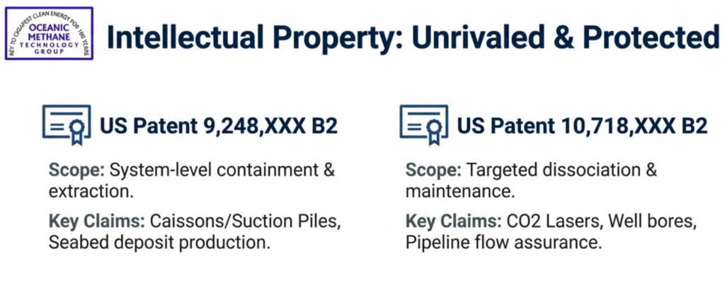 The patent also covers a device for applying electromagnetic radiation to dissociate the gas hydrate beneath the deep sea-floor into methane and water. It consists of four parts.